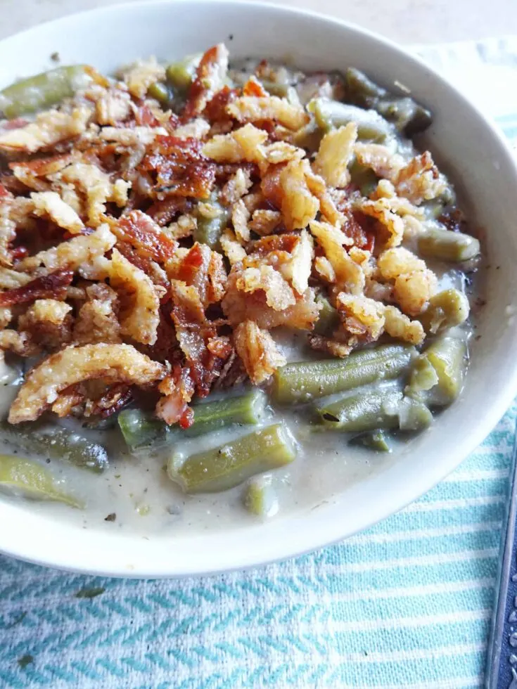 This crockpot green bean casserole with bacon is a newer take on an old favorite. A traditional Thanksgiving side dish, green bean casserole is savory, creamy, and always a hit at the dinner table.