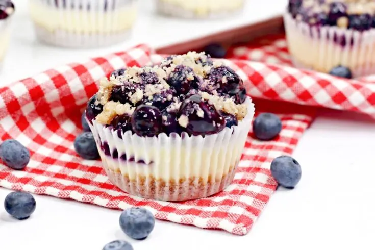 Looking for a dessert for the summer? These Blueberry Pie Mini Cheesecakes are the perfect patriotic and summer dessert to show off some red, white and blue. Plus they’re delicious and great for single servings. The crumble on top gives it an extra pie crunch and texture to add to a blueberry cheesecake recipe.